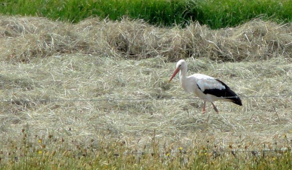 Natuurpunters hebben de voorbije jaren in De vloeiweiden in de watering van Lommel-Kolonie steeds op vele bezoekers, waaronder ook vrij belangrijke vooraanstaande personen, kunnen terugblikken. Hun vrij intensieve, jaarlijks terugkerende beheerwerken op authentieke wijze doorgevoerd, mogen op de sympathie en waardering van velen,waaronder ook de overheid, rekenen. Het bezoek dat ze deze week onaangekondigd tijdens het hooien kregen was zeker uitzonderlijk. Gedurende twee namiddagen streek deze week een prachtige ooievaar neer op een van de percelen waarop volop gehooid werd. De vogel was schijnbaar vertrouwd met landbouwmachines. Terwijl de tractor telkens op vrij korte afstand passeerde, bleef de ooievaar vrij rustig voedsel zoeken tussen het hooi. Waarschijnlijk muizen en andere kleine prooien die op het gemaaide hooiland nu weinig of geen dekking meer hebben om veilig onder te duiken.